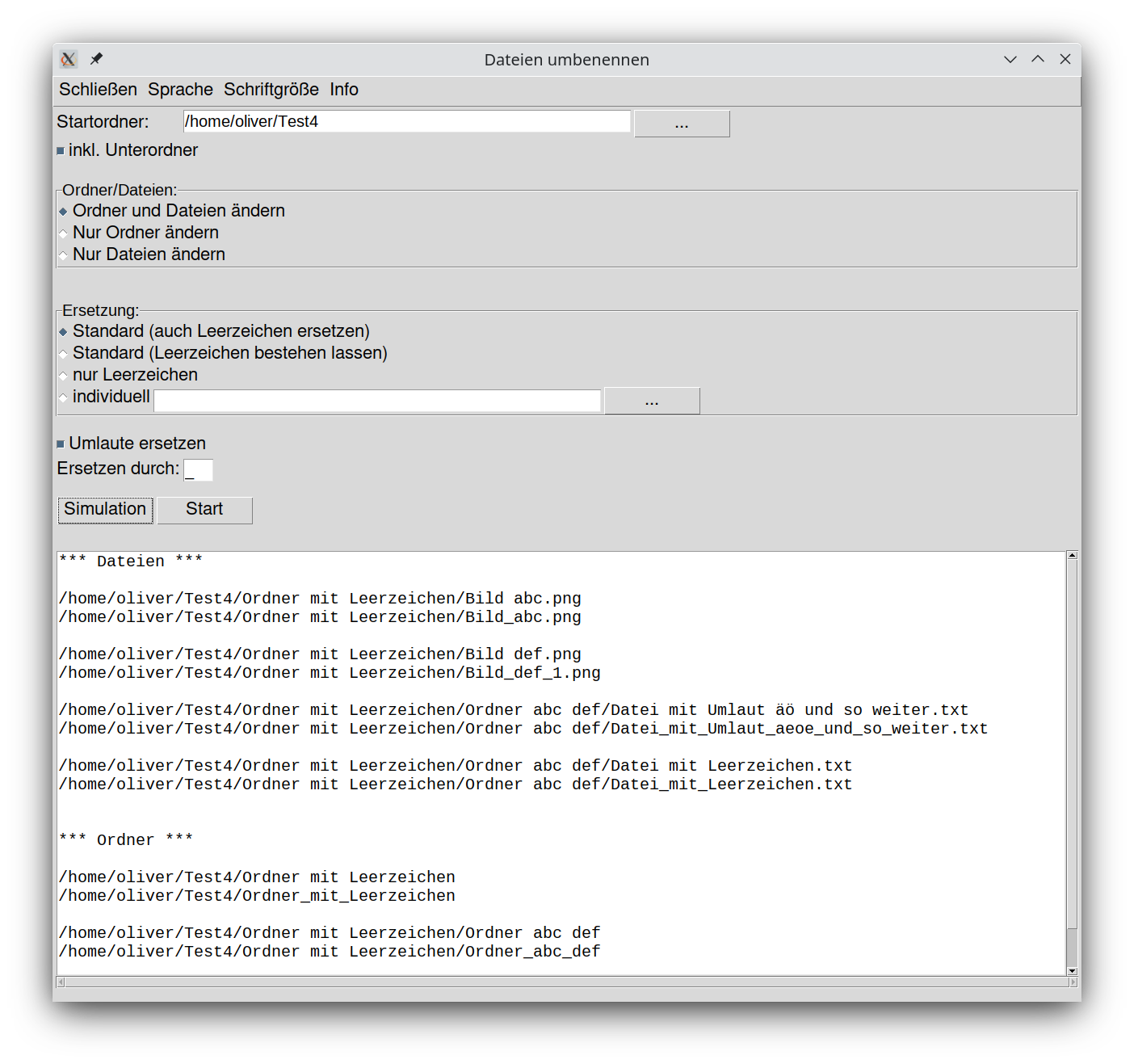 Der Button "Simulation" simuliert die Umbenennungen. Das simulierte Ergebnis wird im Textfeld darunter angezeigt. Für jede (simulierte) Umbenennung gibt es zwei Zeilen. Die obere Zele zeigt den ursprünglichen Ordner-/Dateinamen, die untere Zeile den neuen Namen. Wenn der neue Dateiname bereits existiert, wird der neue Dateiname um "_1" (oder "_2" usw.) erweitert.